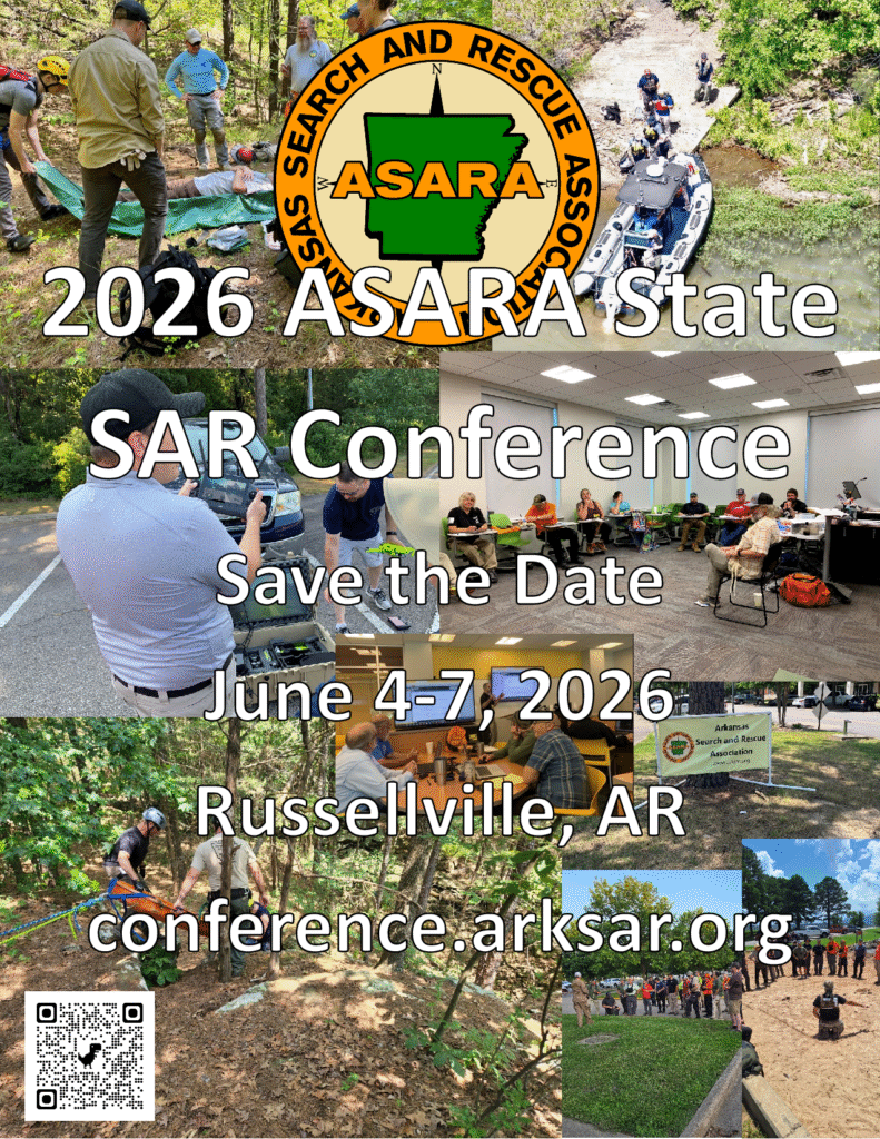 The Arkansas Search and Rescue Association Board is excited to announce that we will be hosting the 2026 ASARA State Conference June 6-7, 2026 with pre-conference training on Thursday, June 4 and Friday, June 5. The conference will be hosted at Arkansas Tech University in Russellville, AR. More information will be released soon.